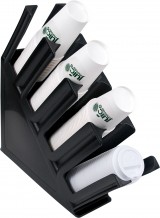 Черный 4-х секционный линейный настольный органайзер для одноразовых стаканов и крышек изготовлен из ударопрочного пластика методом литья под давлением. Предназначен для стаканов любого объема, вплоть до 900 мл. Вмещает порядка 140 бумажных кофейных стаканов, объемом 250 мл. Литая конструкция фундаментально надежна т.к. изготовлена единой и цельной в отличие от хрупких, склеенных из частей, органайзеров из акрила или фанеры.