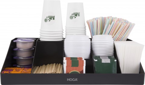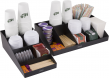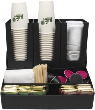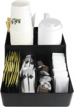 Компактный настольный органайзер для кофейной зоны на 10 отделений сохранит в порядке все ваши принадлежности для кофе и чая: стаканы, крышки, салфетки, пакетики с чаем и сахаром, мешалки и сливки и пр. Вмещает стаканы и крышки диаметром до 93 мм.